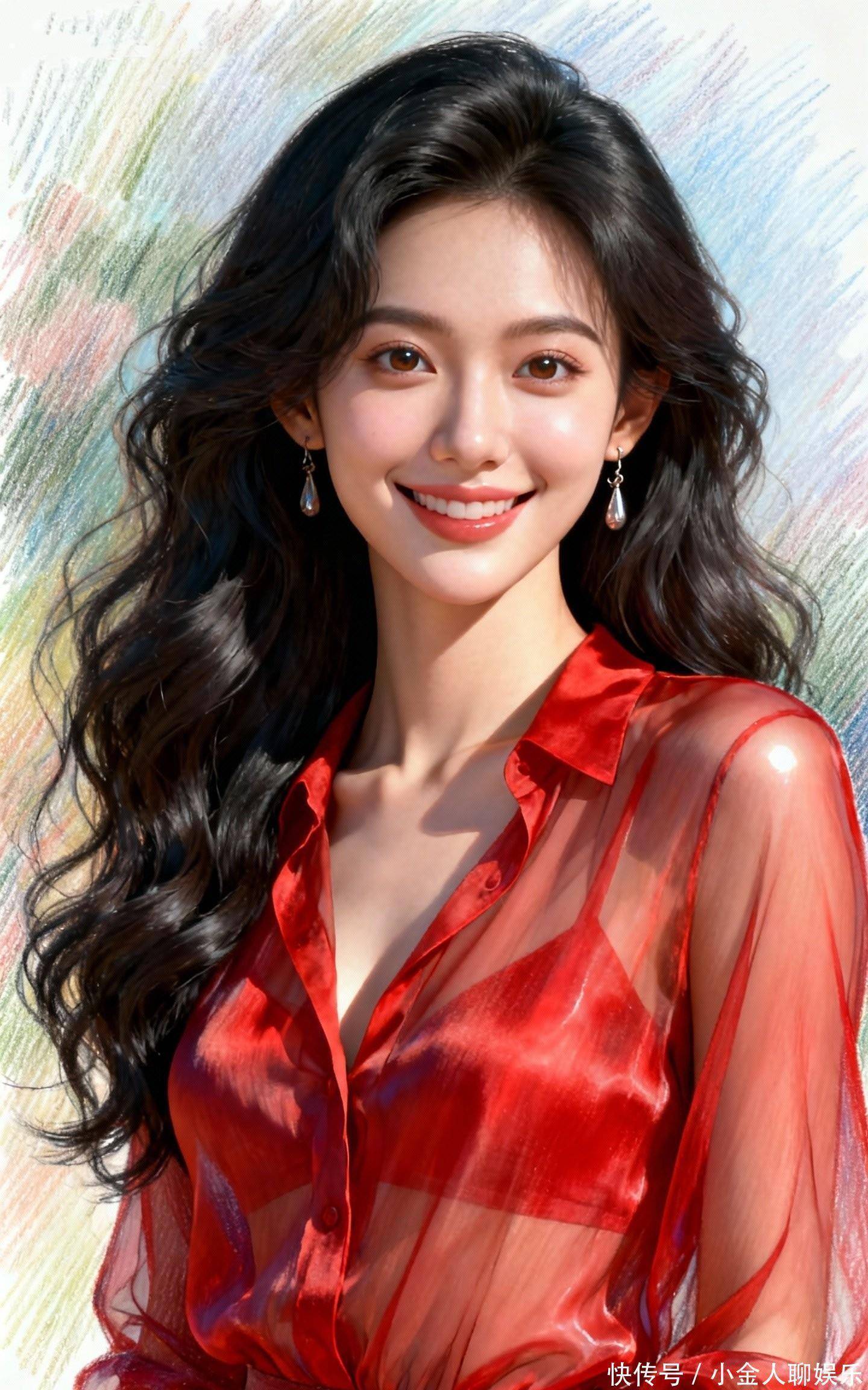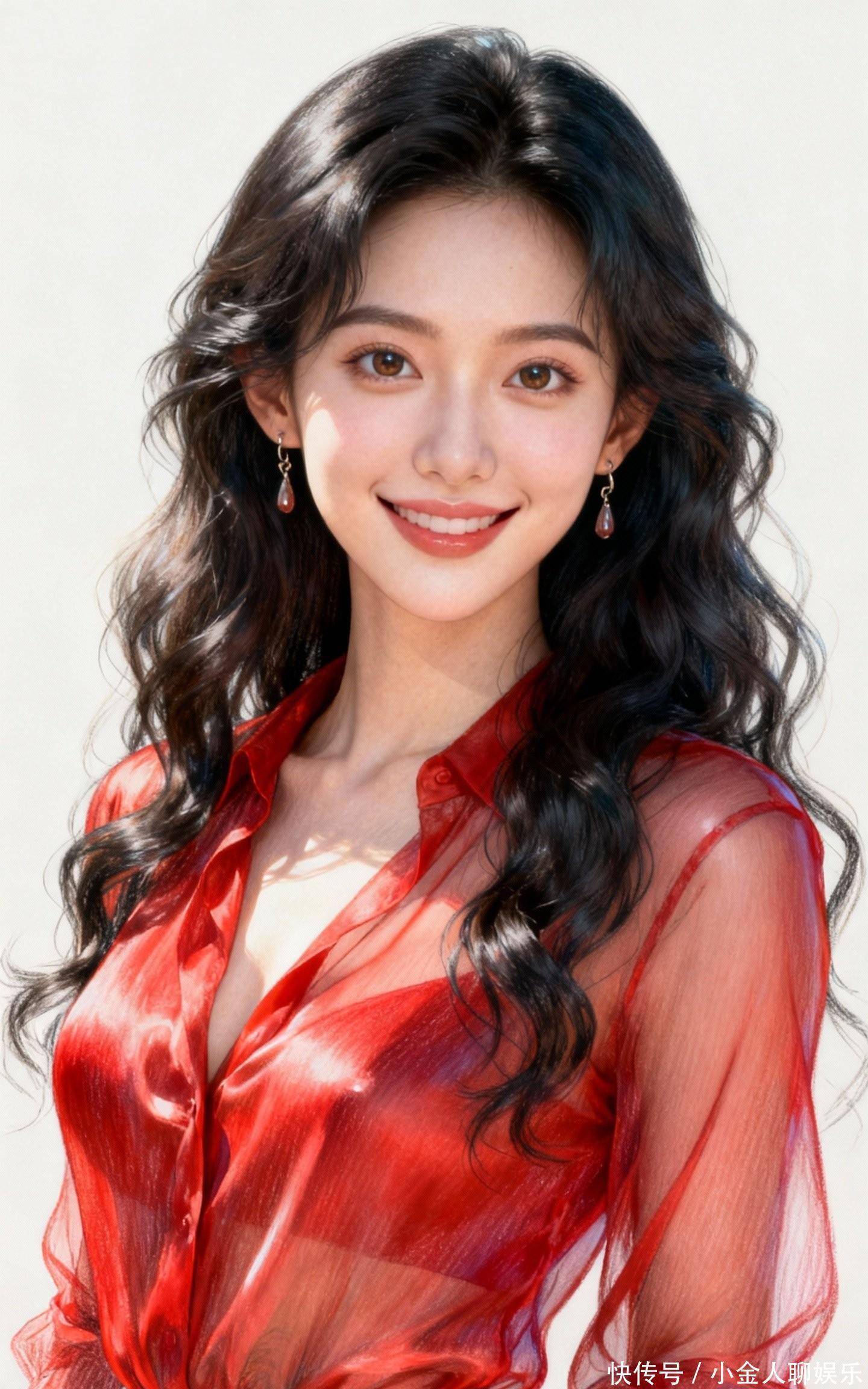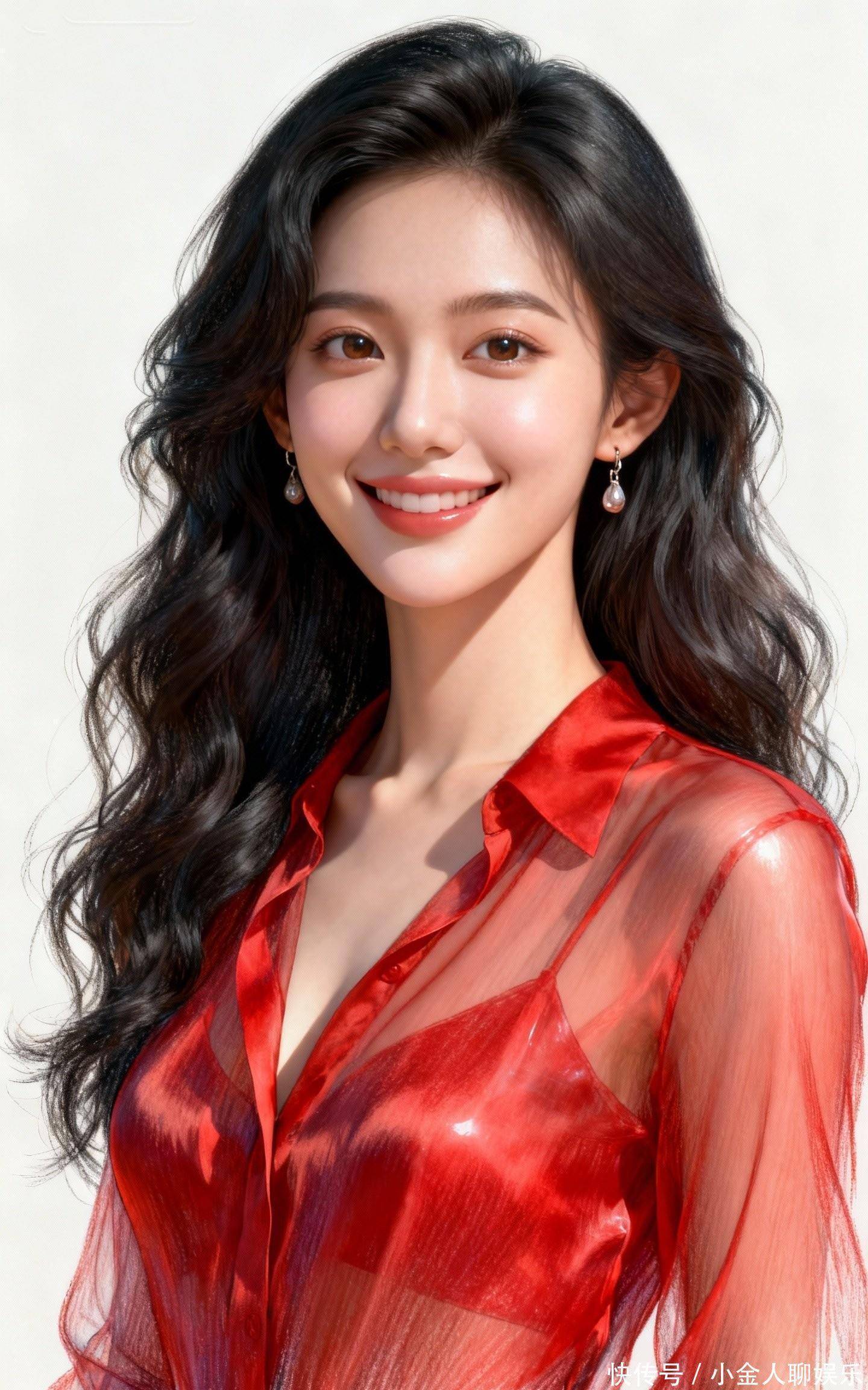 黑长卷发衬着雪白的肩颈,红色薄纱衬衫裹着恰到好处的明艳,笑起来时眼尾弯成月牙,连耳坠都跟着晃出温柔的光。这哪是画啊?分明是把“东方美人”的氛围感焊在了画布上!