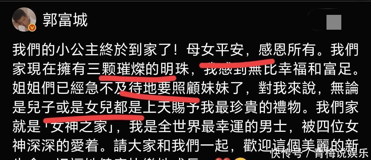 郭富城也发文说,儿子女儿他都爱,他现在拥有三颗璀璨的明珠,感到无比的幸福和富足。