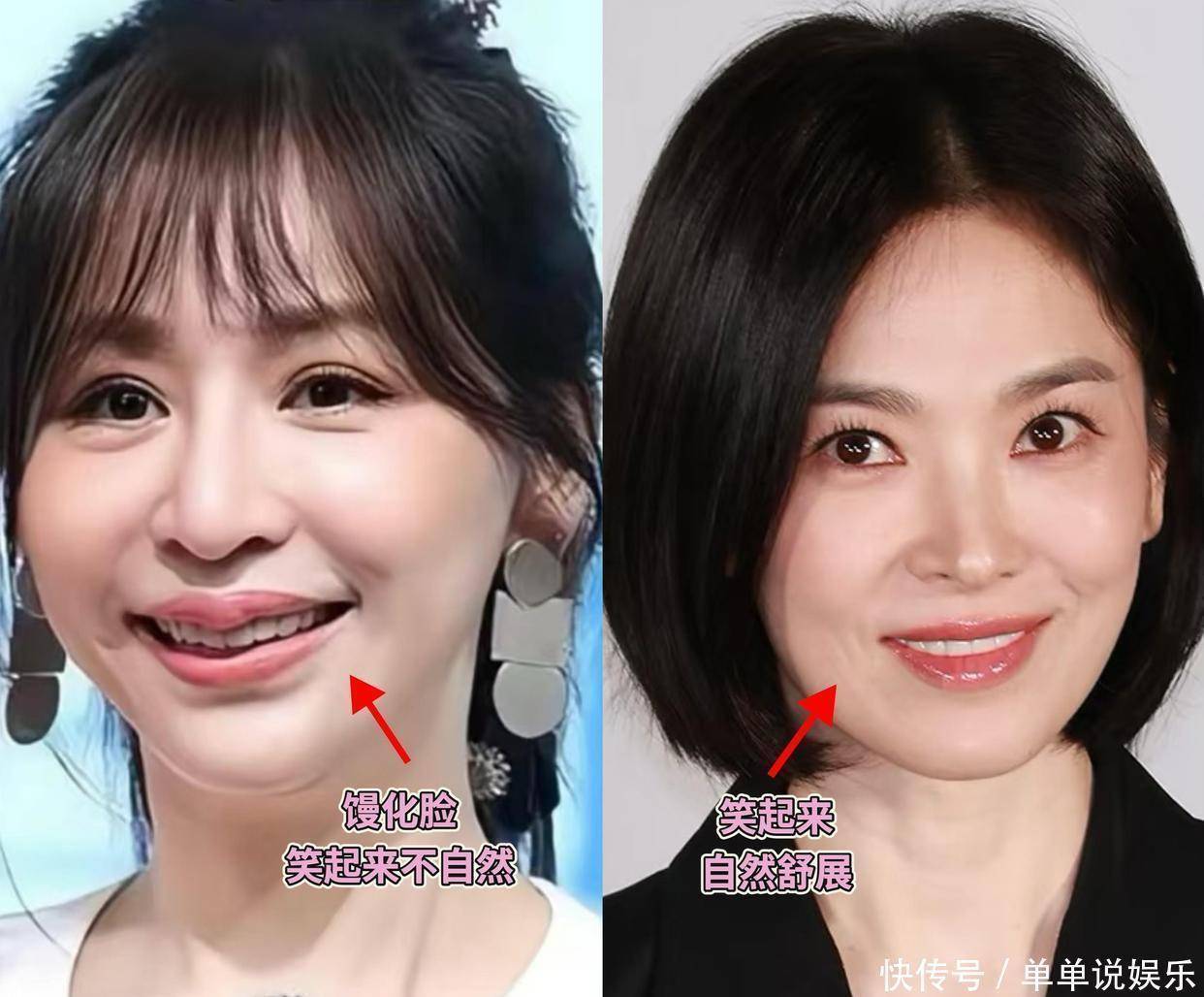 馒化脸最要命的地方就是“表情失控”吧,不管是水肿还是发福,又或者过度填充,都很容易让脸上的肌肉控制不了了,甚至在笑的时候苹果肌不动,嘴角也不抬,看着特别僵硬。而没有馒化的人,用起来表情就挺自然、挺顺畅的,不会出现那种皮笑肉不笑的搞笑场面。
